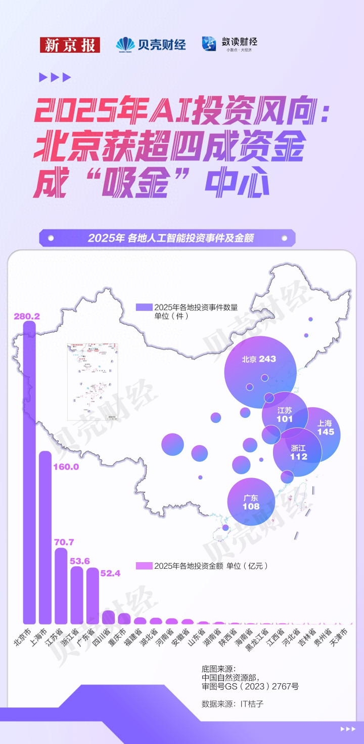 这种互动关系,也决定了资金的流向。2025年初DeepSeek引发全球瞩目,国内人工智能融资活动明显回暖。全年共发生约850起融资事件,总金额约692.3亿元。其中,北京以243起投资事件、280.2亿元的融资规模位居全国首位。